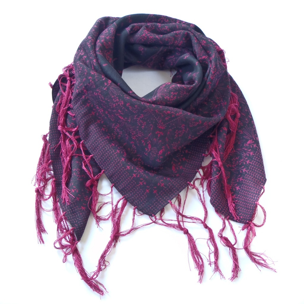 Čtvercový šátek s třásněmi a drobným květinovým vzorem.