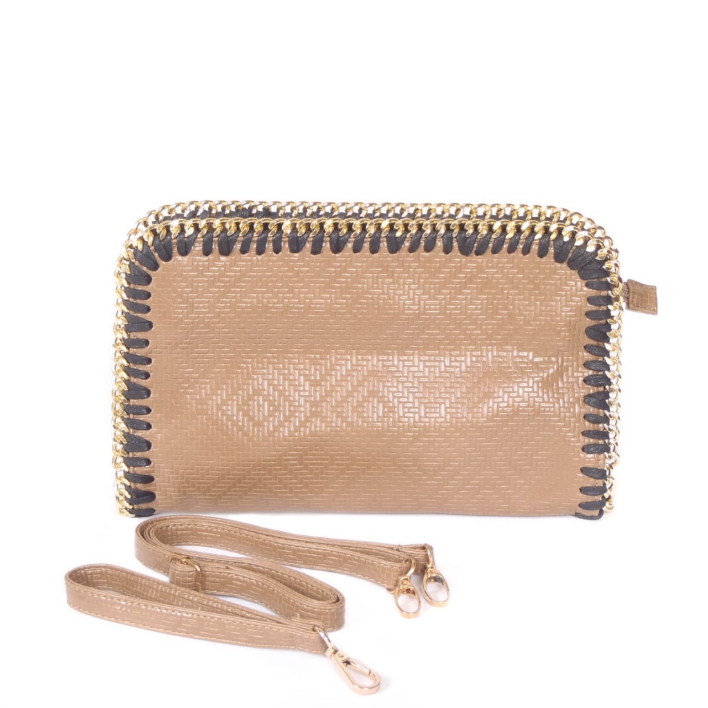 Kabelka ze syntetické kůže,podšívkovaná 100%PES. Kabelka je lemovaná zlatým řetízkem. Model má připínací popruh s nastavitelnou délkou až 120 cm a řemínek na ruku.