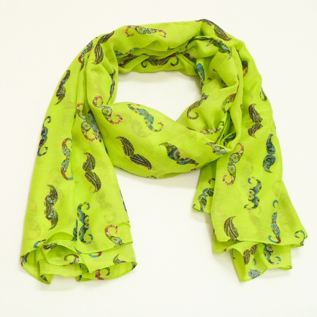 Šátek v neonově zelené barvě s potiskem knírů. Potisk je inspirován nadací Movember.