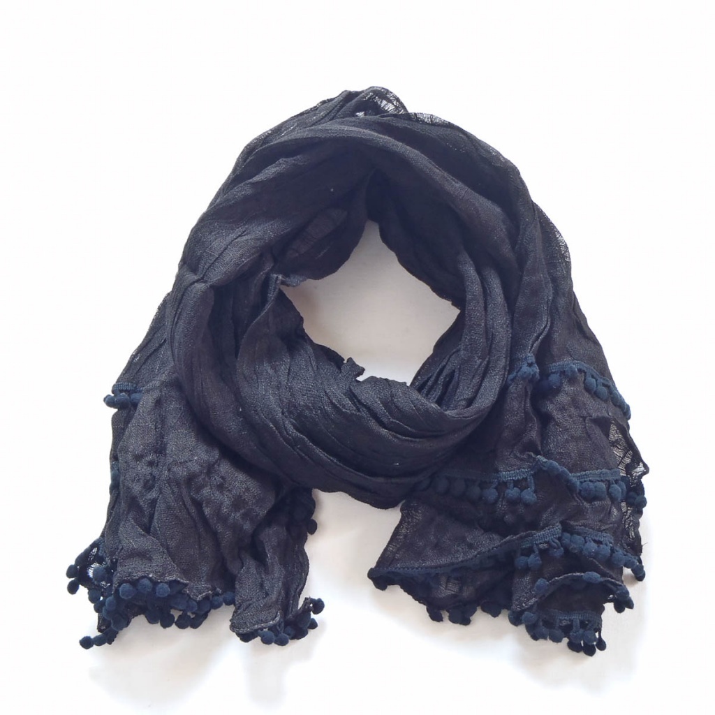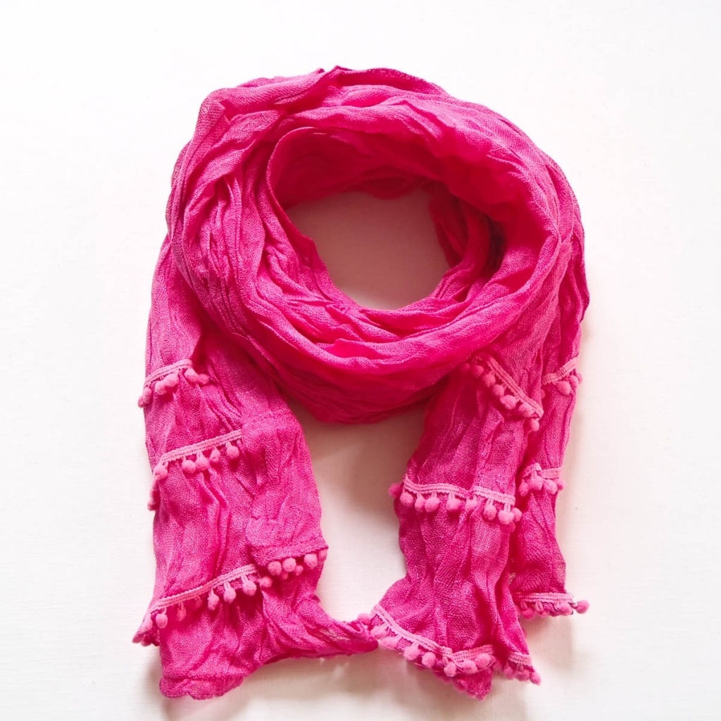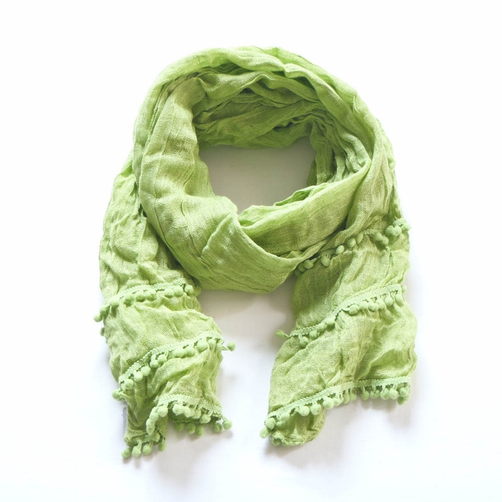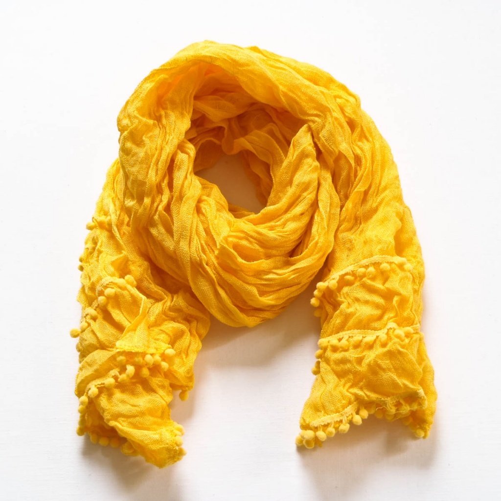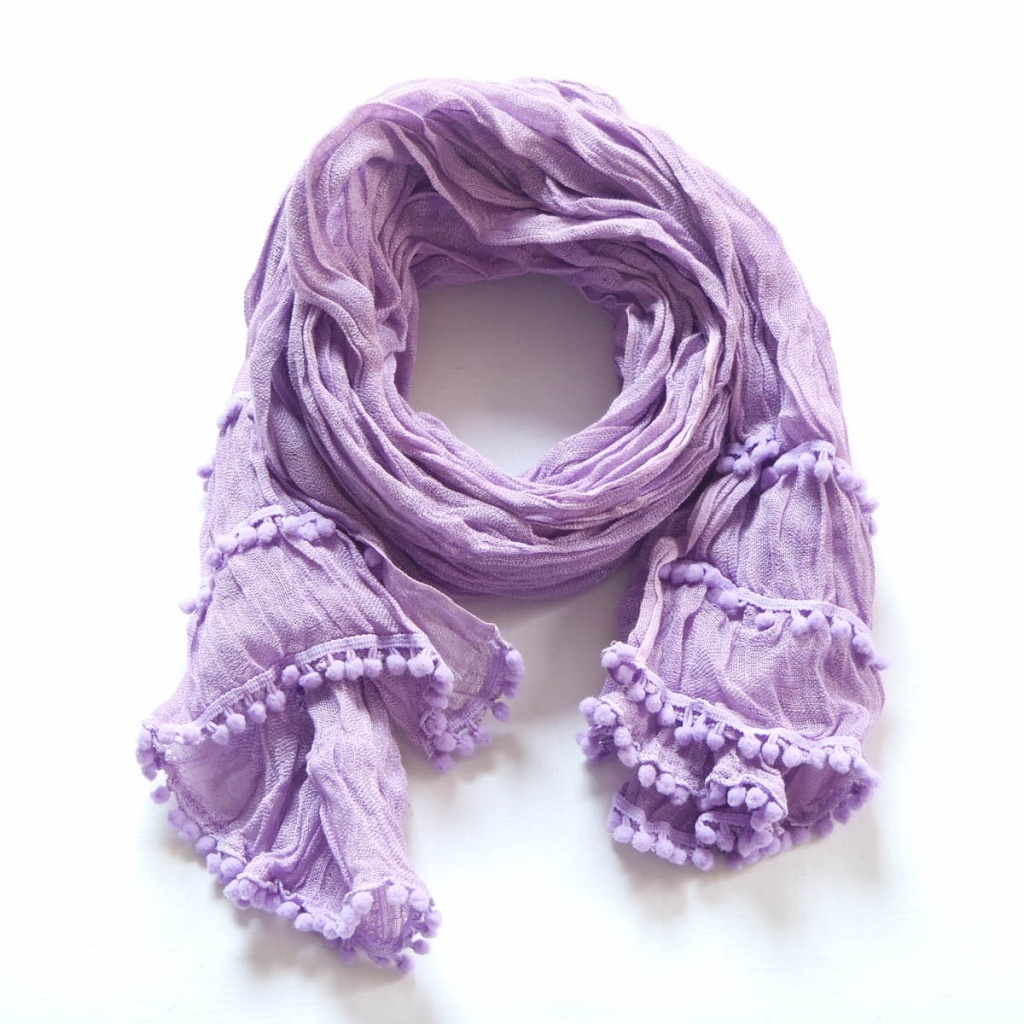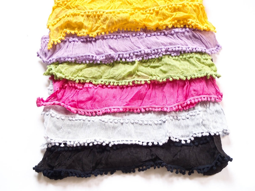 Šátek v šesti barevných variantách s bambulkami na kratších stranách.