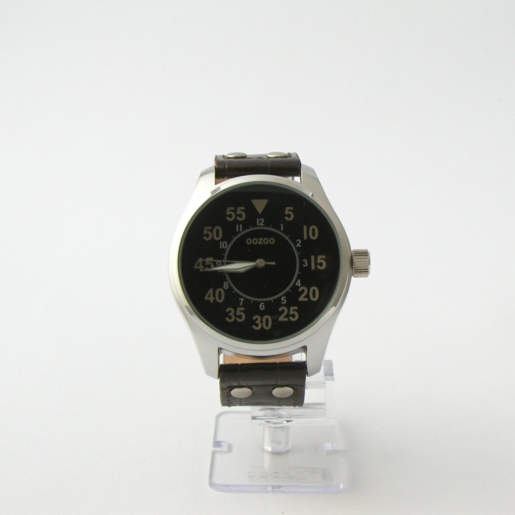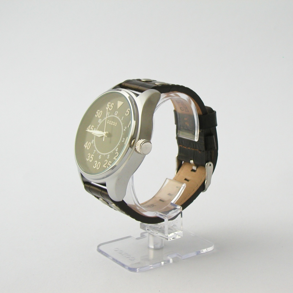 Hodinky s koženým řemínkem. Ciferník o průměru 5 cm.
