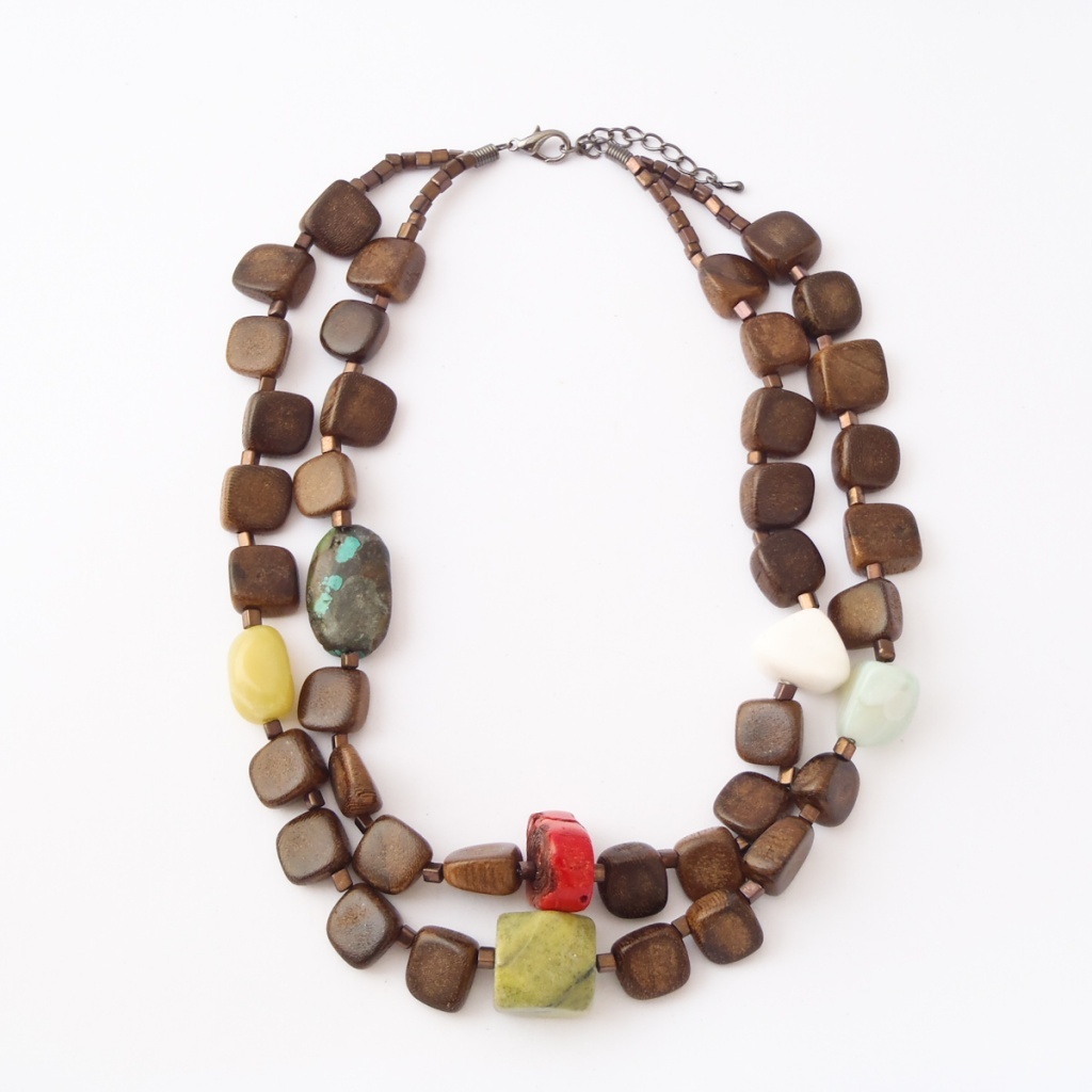 Náhrdelník z dřevěných komponentů, korálu, chryzokolu a kamínků.
