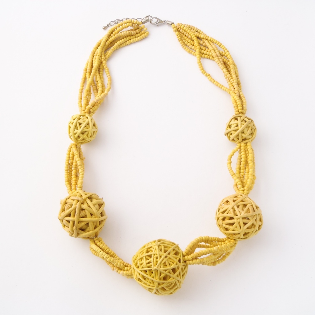 Náhrdelník je prodejný jako set (náhrdelník, náušnice). Náhrdelník je vyrobený z lýka a dřevěných korálků. Náušnice jsou vyrobené z lýka o velikosti 3 cm.