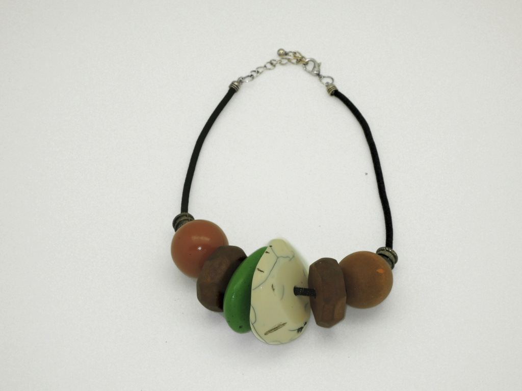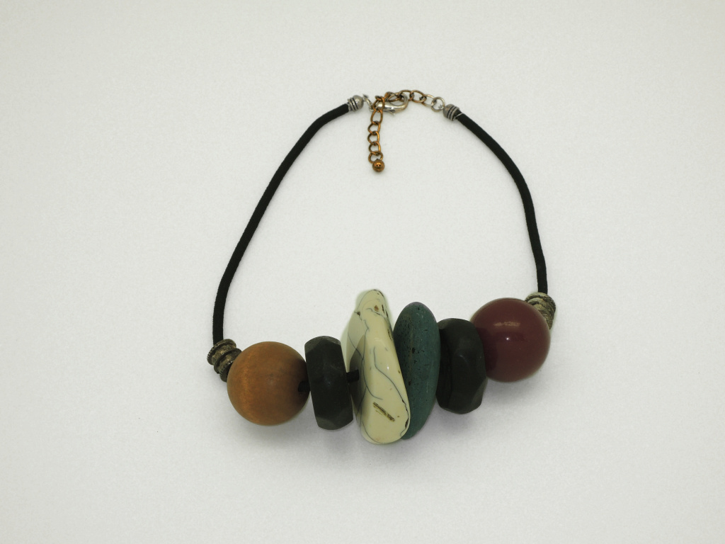 Náhrdelník s kamennými a dřevěnými komponenty na kožené šňůrce ve dvou barevných kombinacích- zelené a tmavě modré