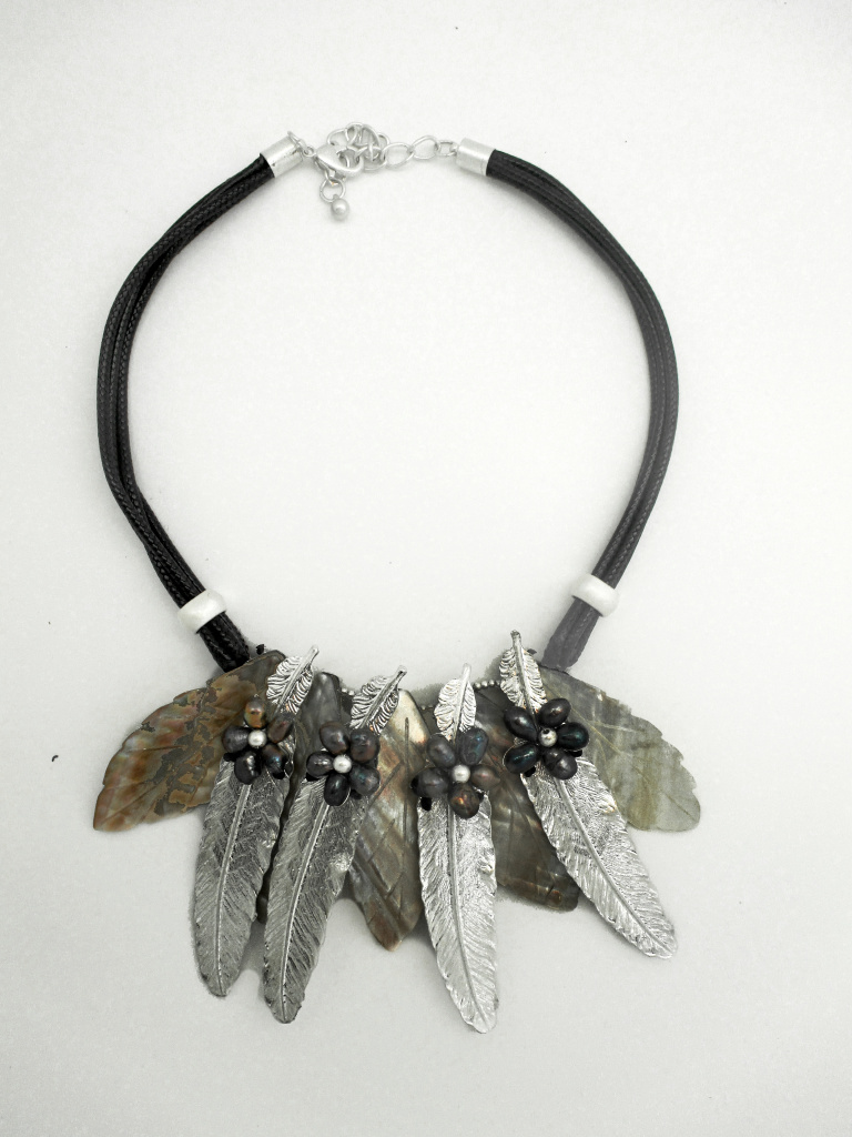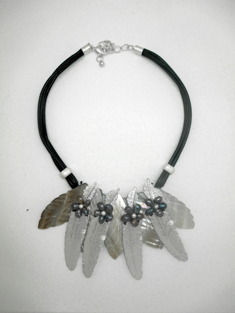 Perleťové a kovové lístky na kožených šňůrkách ve dvou variantách - zlaté a stříbrné