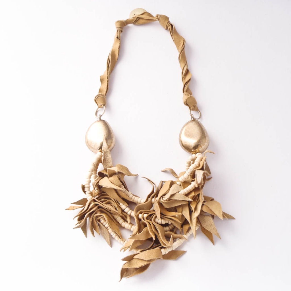 Náhrdelník ze syntetické kůže a dřevěných korálků.