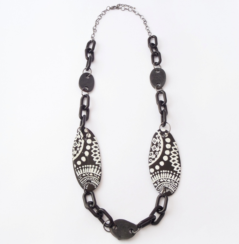 Náhrdelník z dřevěných malovaných placek spojované plastovým řetízkem.