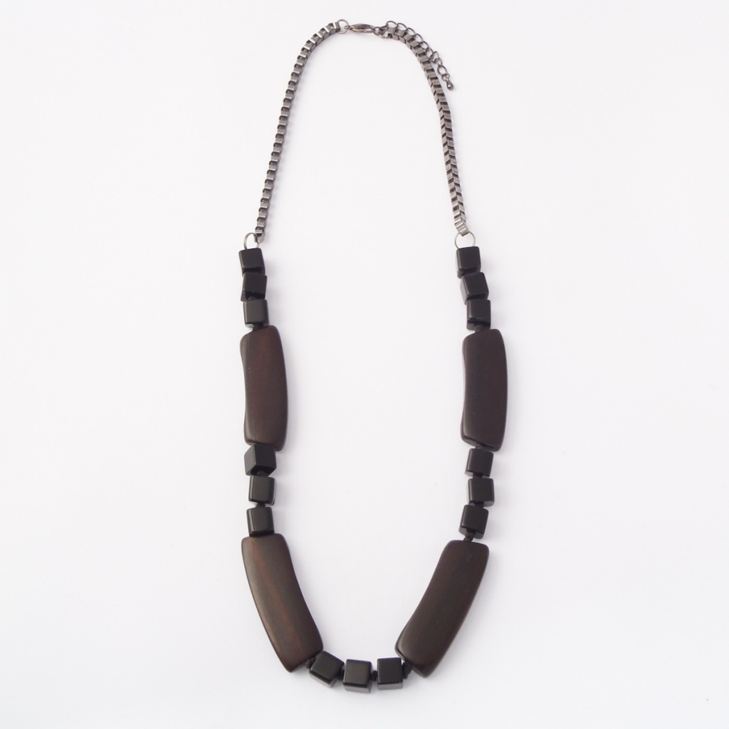 Náhrdelník z dřevěných komponentů a bižuterního kovu.