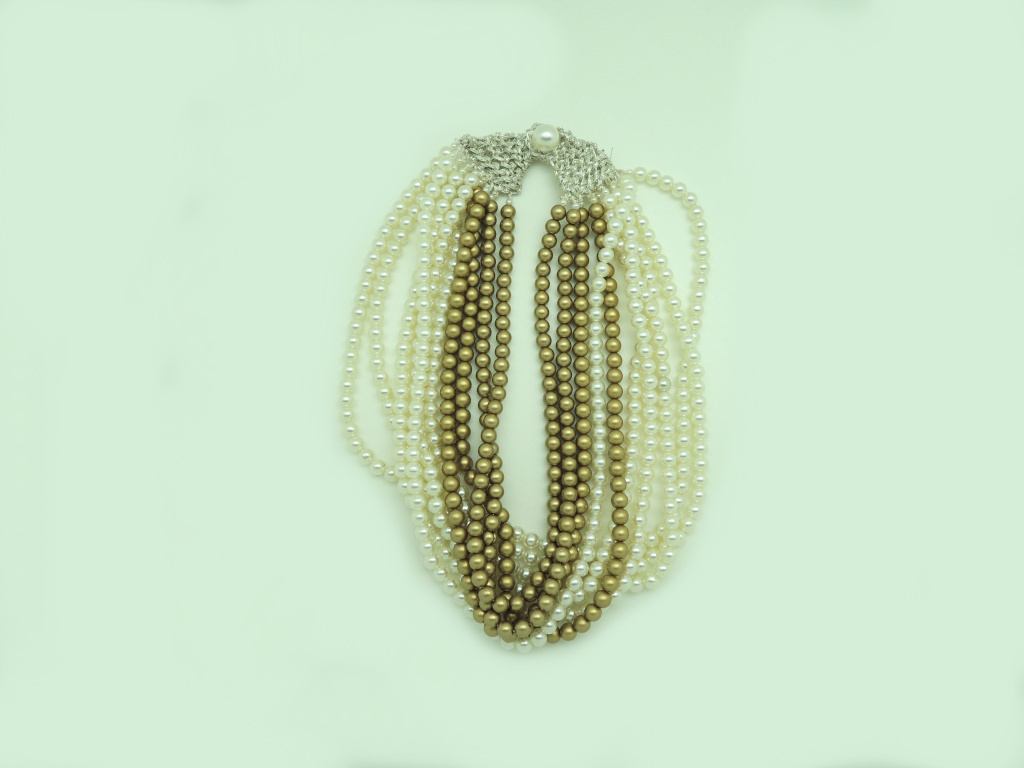 Několika řadový náhrdelník z bižuterních korálků ve zlaté a bílé barvě
