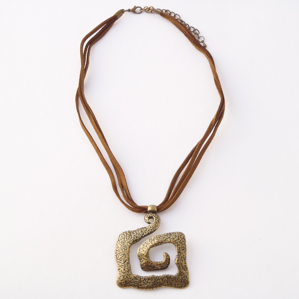 Přívěšek z bižuterního kovu o velikosti 5x5 cm zavěšený na tkanici ze syntetické kůže.