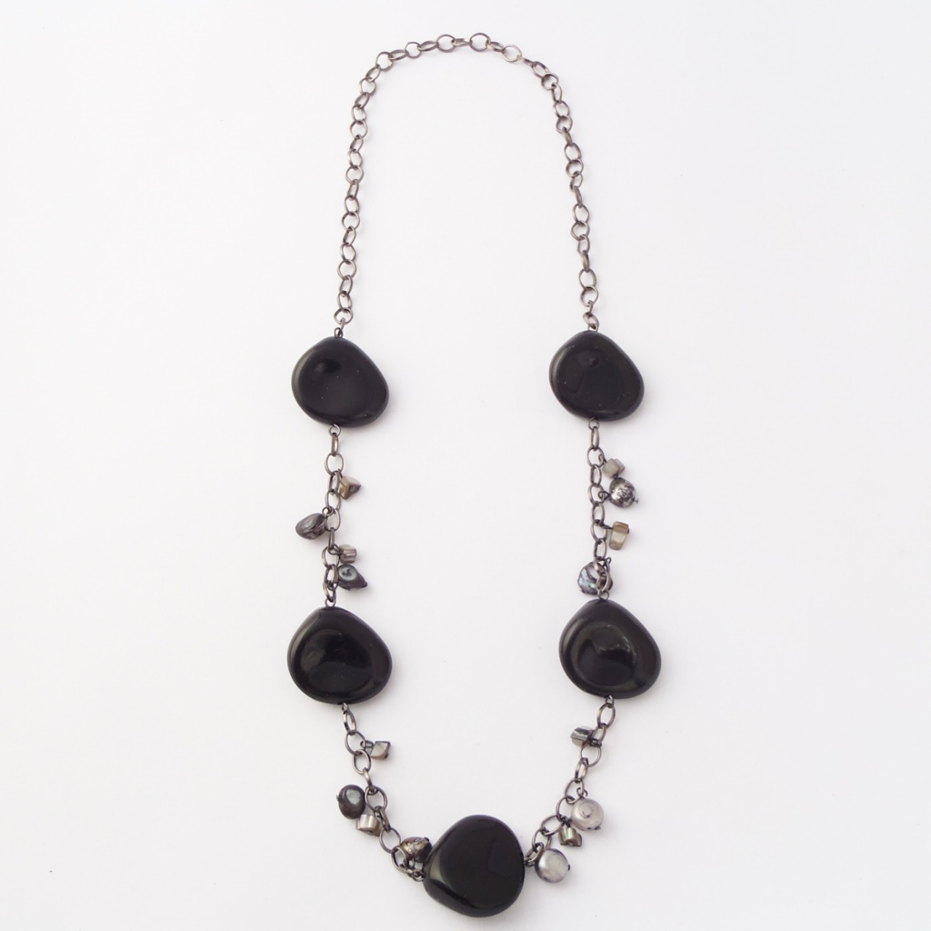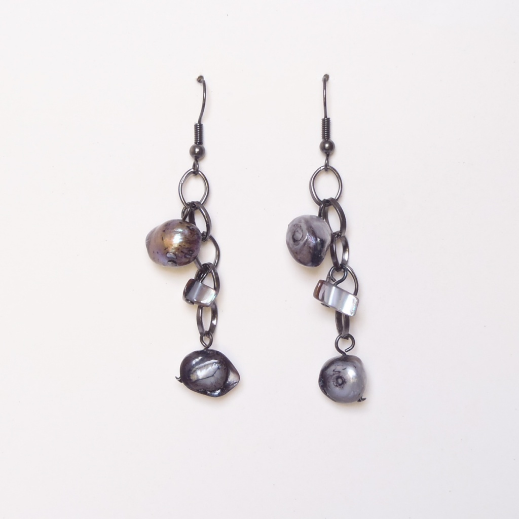 Náhrdelník je prodejný jako set (náhrdelník, náušnice). Náhrdelník je vyrobený z říčních perel a plastových kamínků. Náušnice jsou vyrobené z říčních perel.