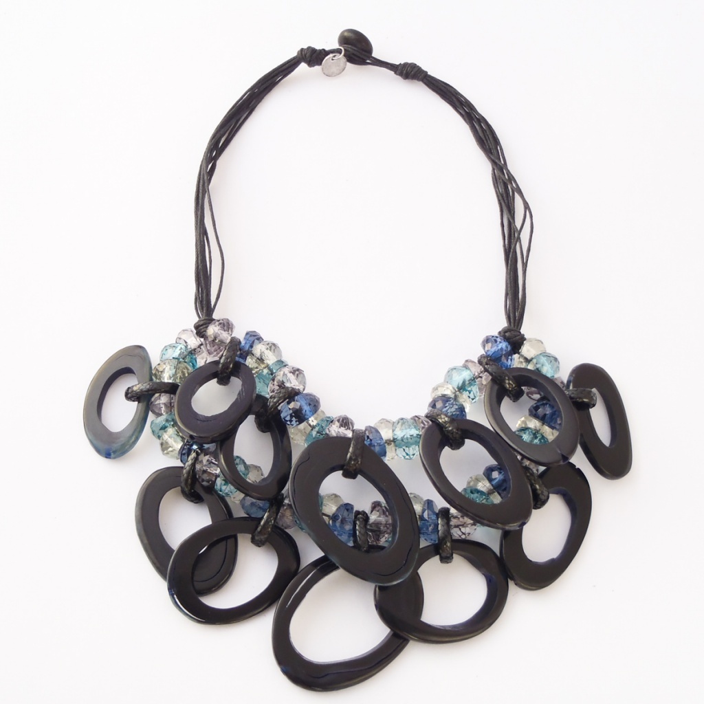 Náhrdelník z rohoviny, bižuterních korálků a textilních povoskovaných šňůrek.