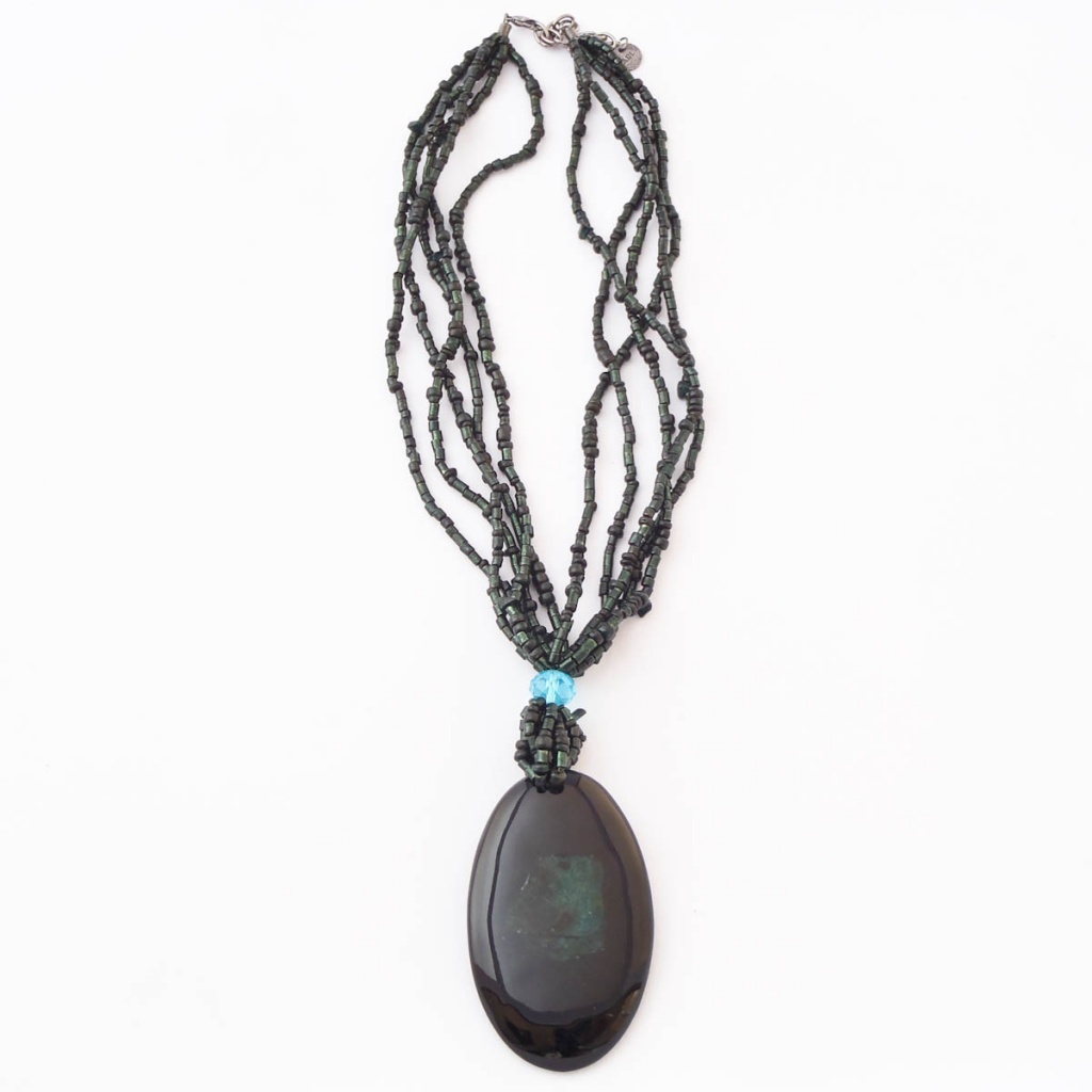 Náhrdelník s přívěškem z pryskyřice se zalitou skořepinou.