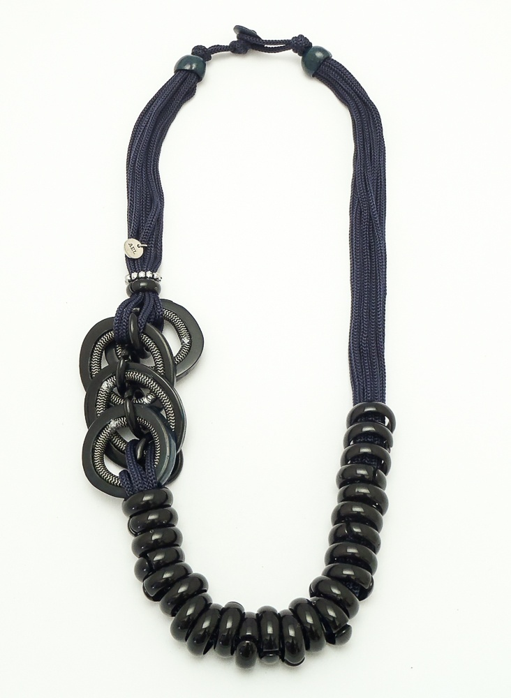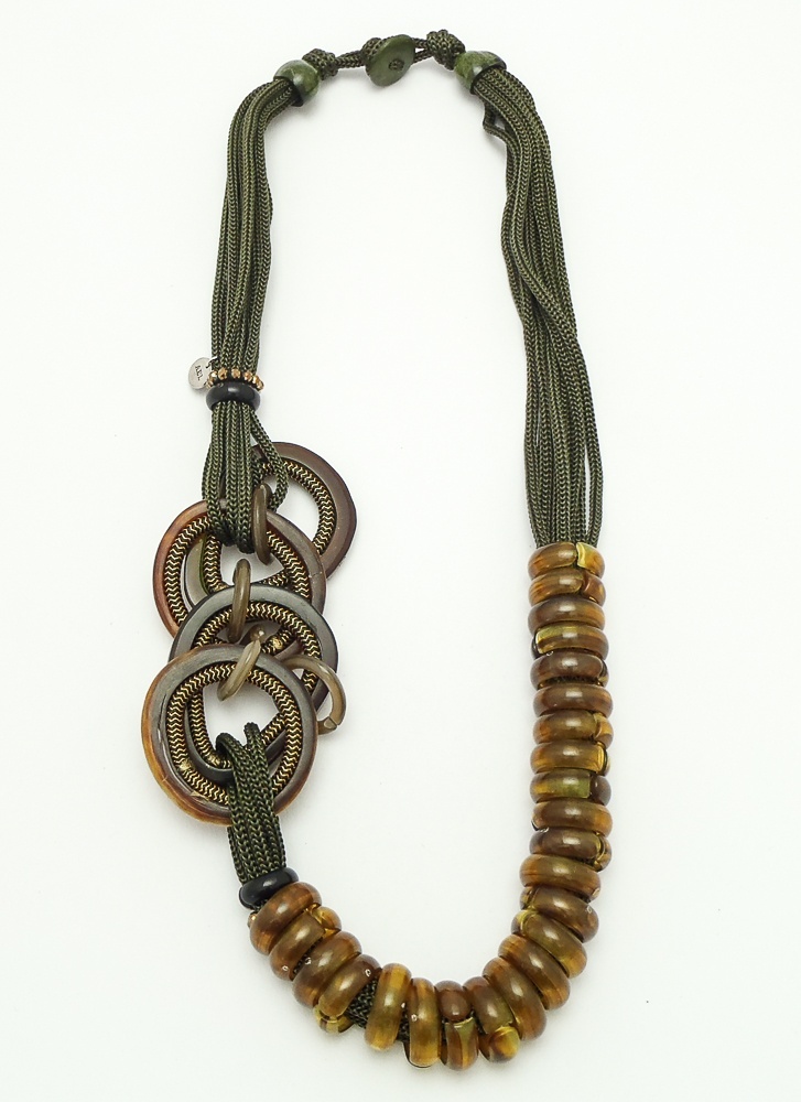 Náhrdelník z rohoviny, textilních tkanic a korálků.
