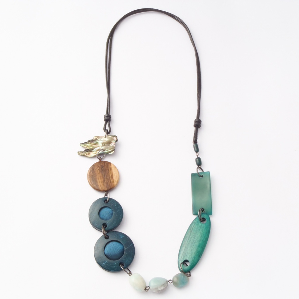 Náhrdelník z dřevěných komponentů, textilní látky, říční perly a kamene.
