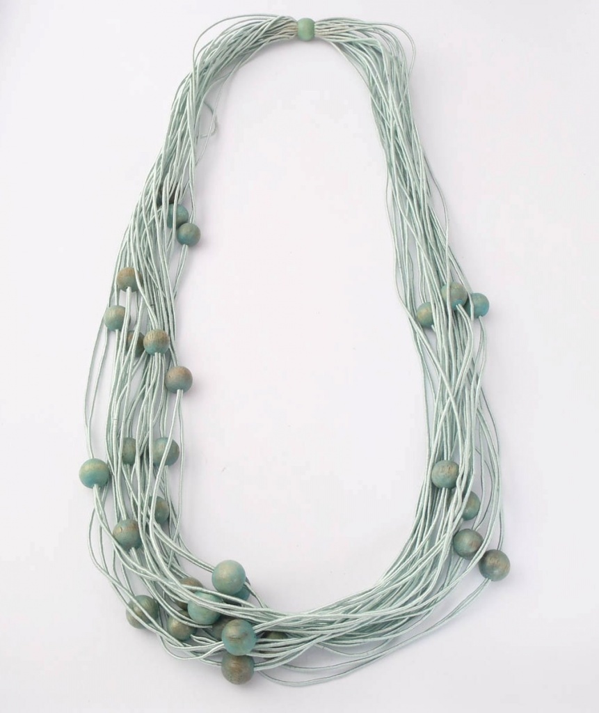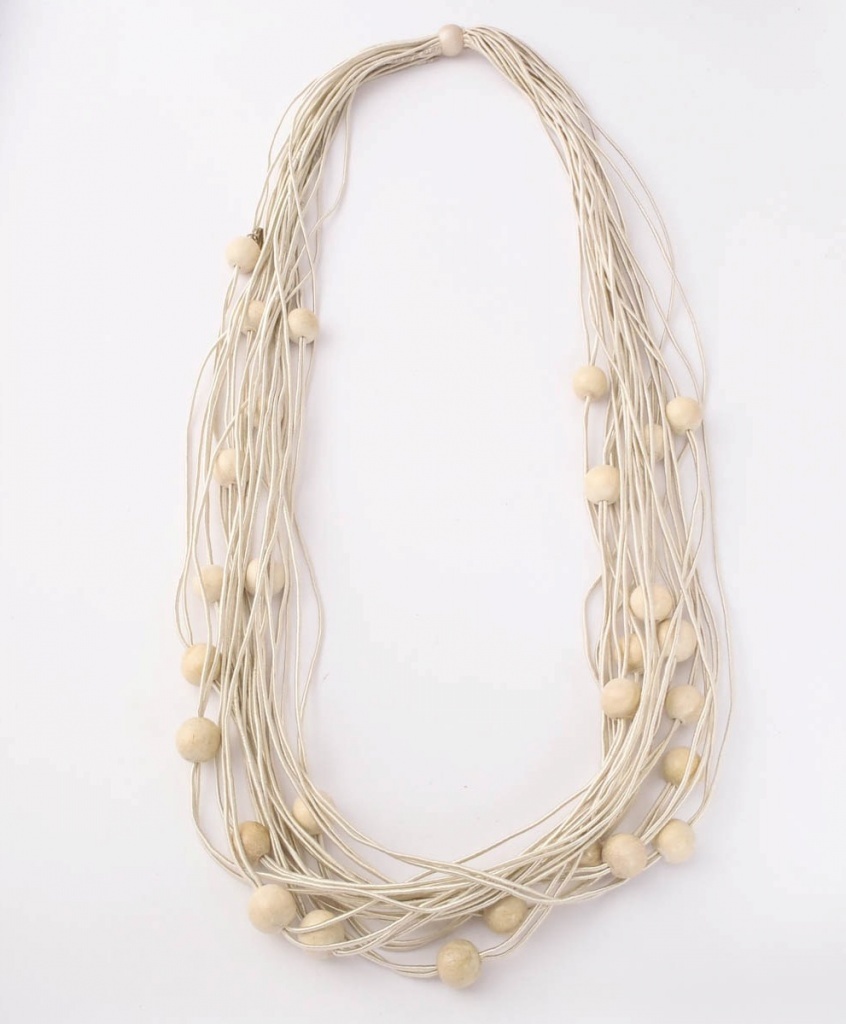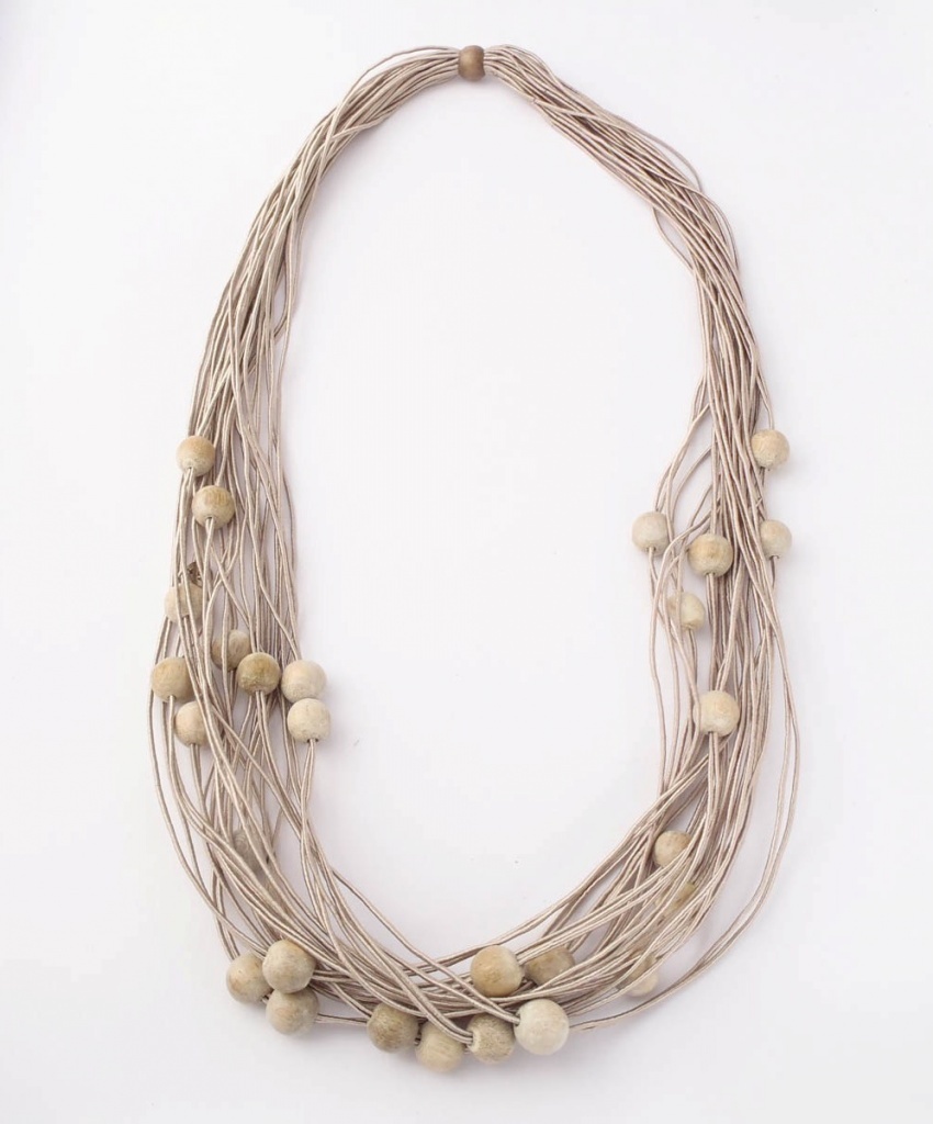 Náhrdelník z textilních šňůrek s navlečenými dřevěnými korálky.