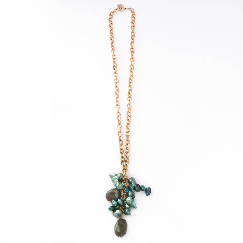 Náhrdelník s říčními perlami a chryzokolem zavěšené na zlatém řetízku z bižuterního kovu.