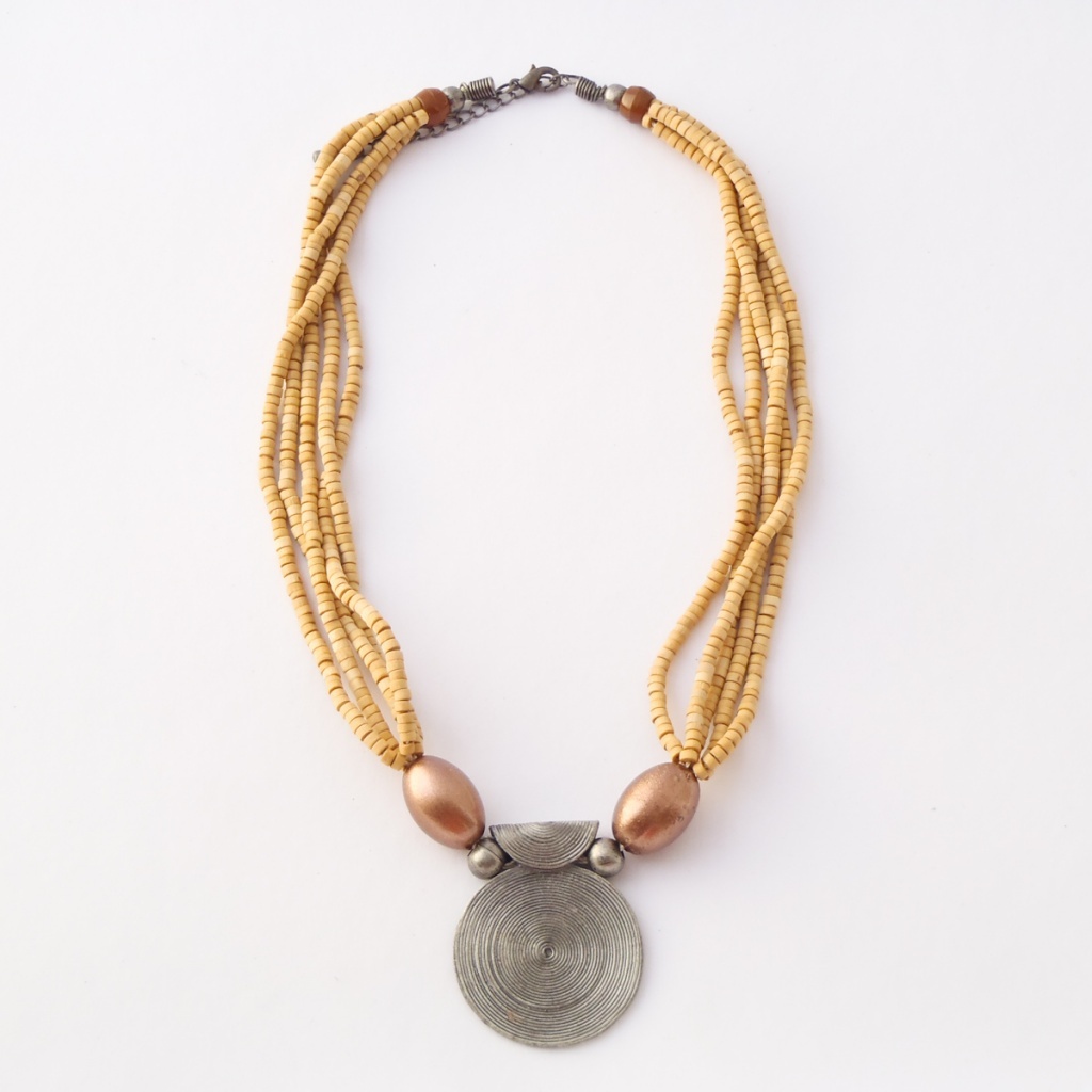 Náhrdelník z dřevěných korálků a přívěšku z bižuterního kovu o velikosti 3x3 cm.
