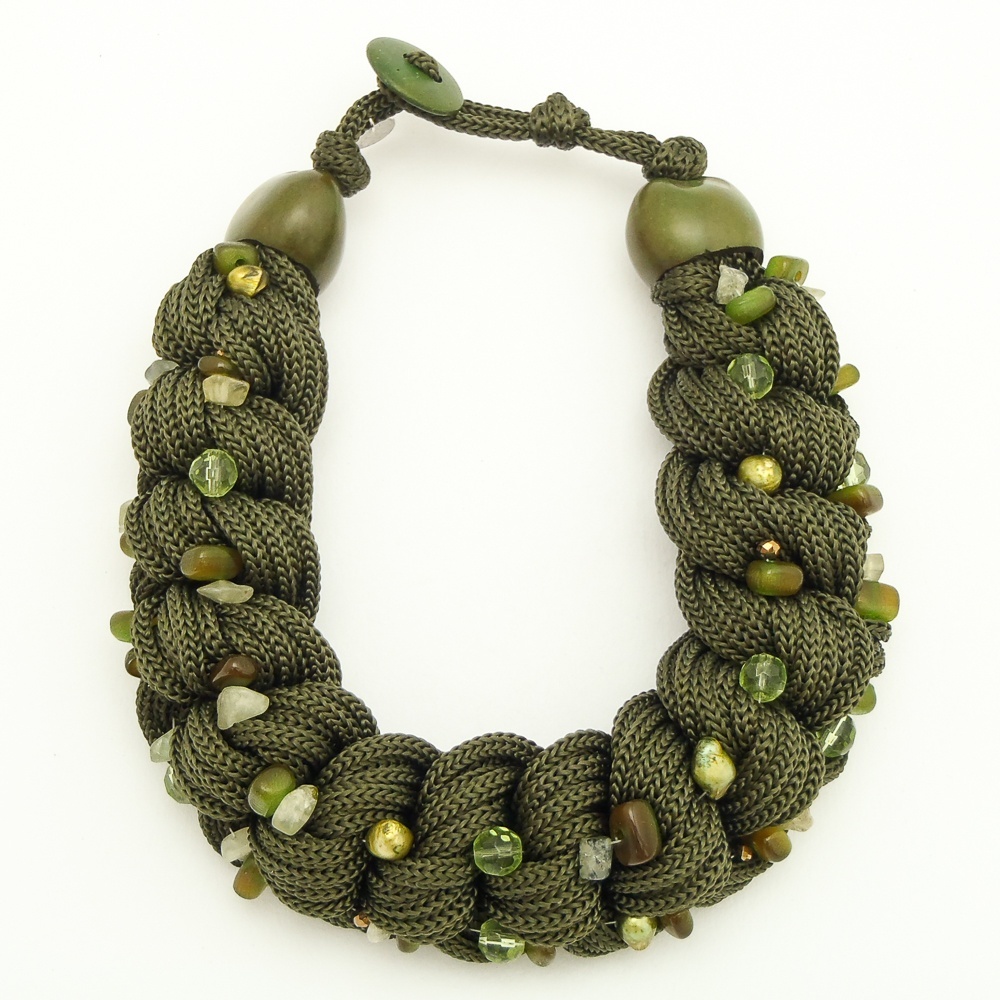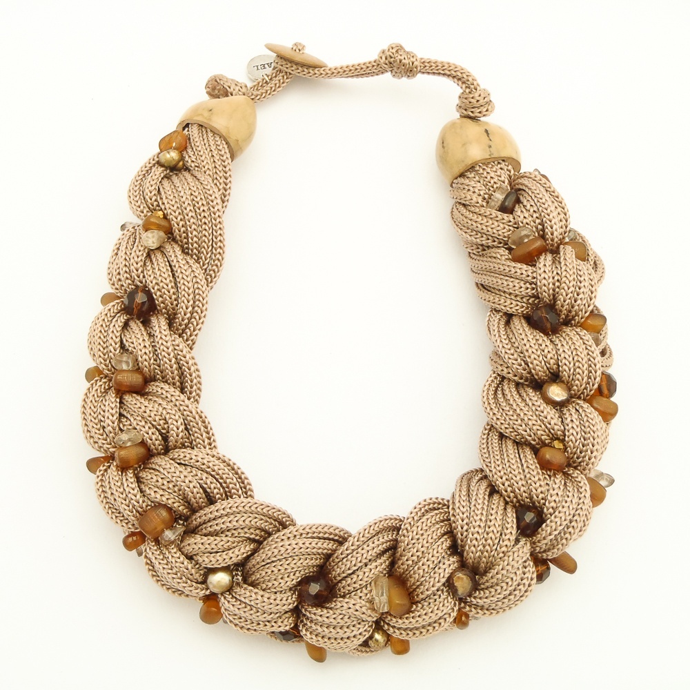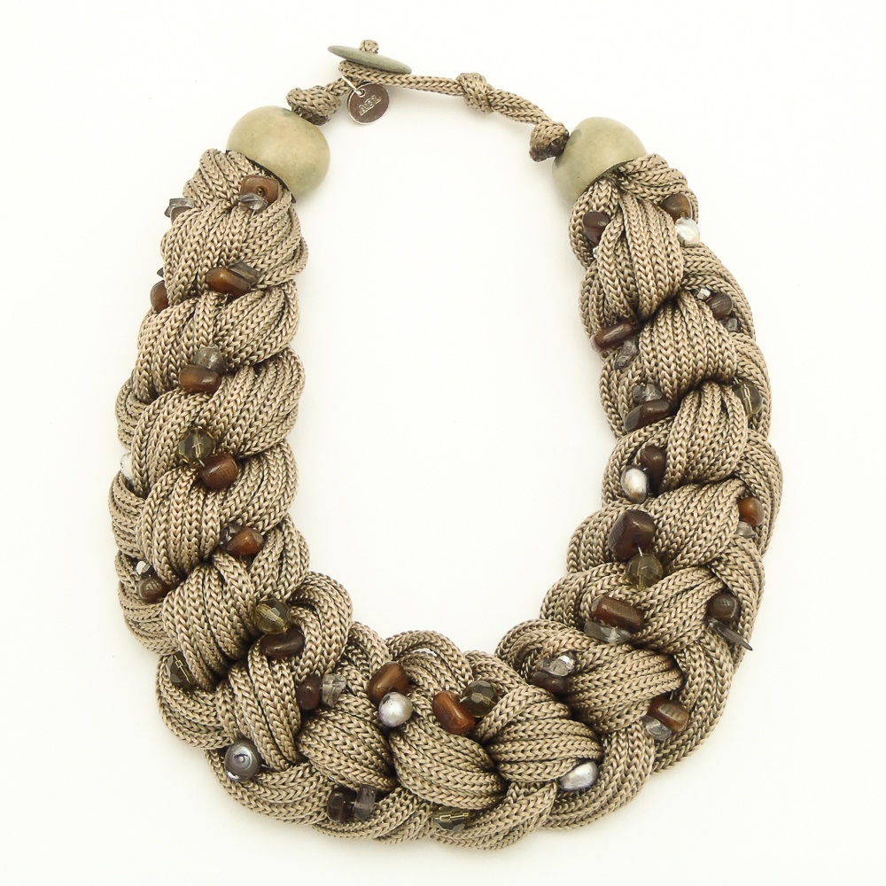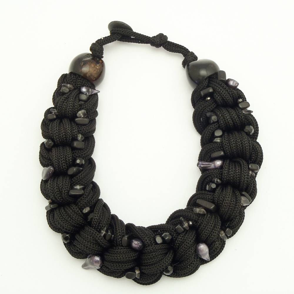 Náhrdelník z textilních tkanic, které jsou spletené do copu. Cop je posázený říčními perlami.
