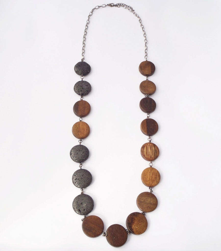Náhrdelník z dřevěných komponentů, bižuterního kovu a kamene.