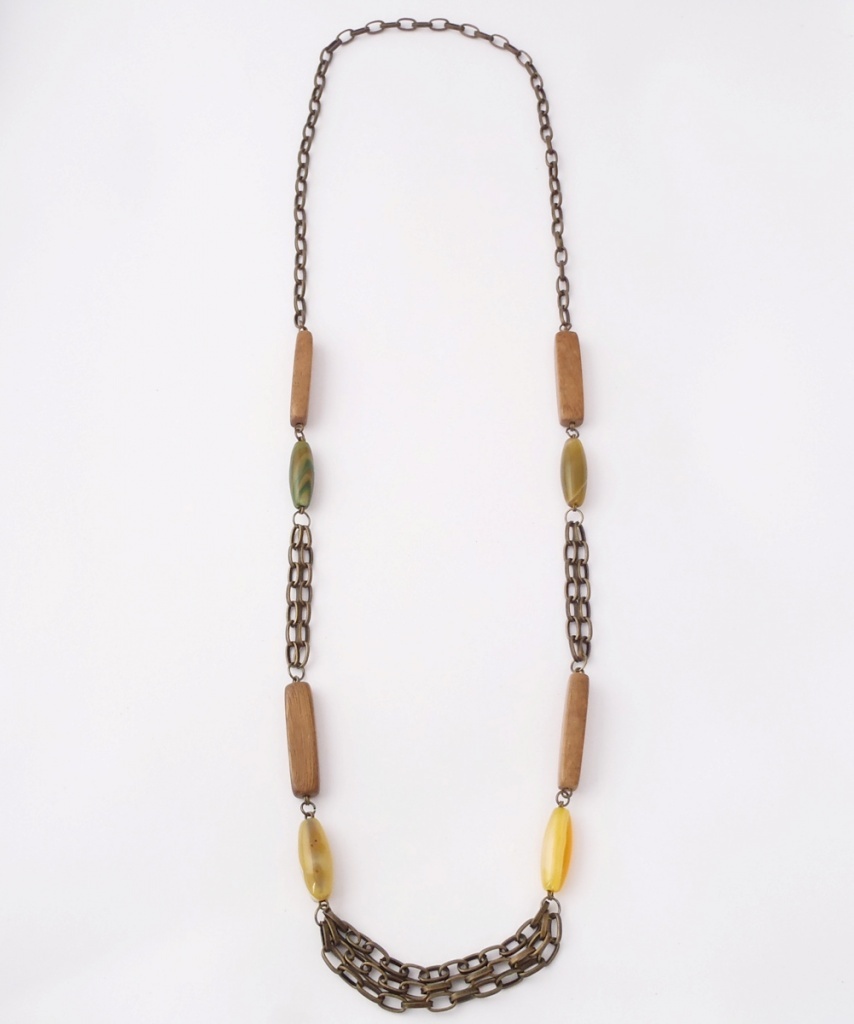 Náhrdelník z dřevěných komponentů, bižuterního kovu a polodrahokamu achát.