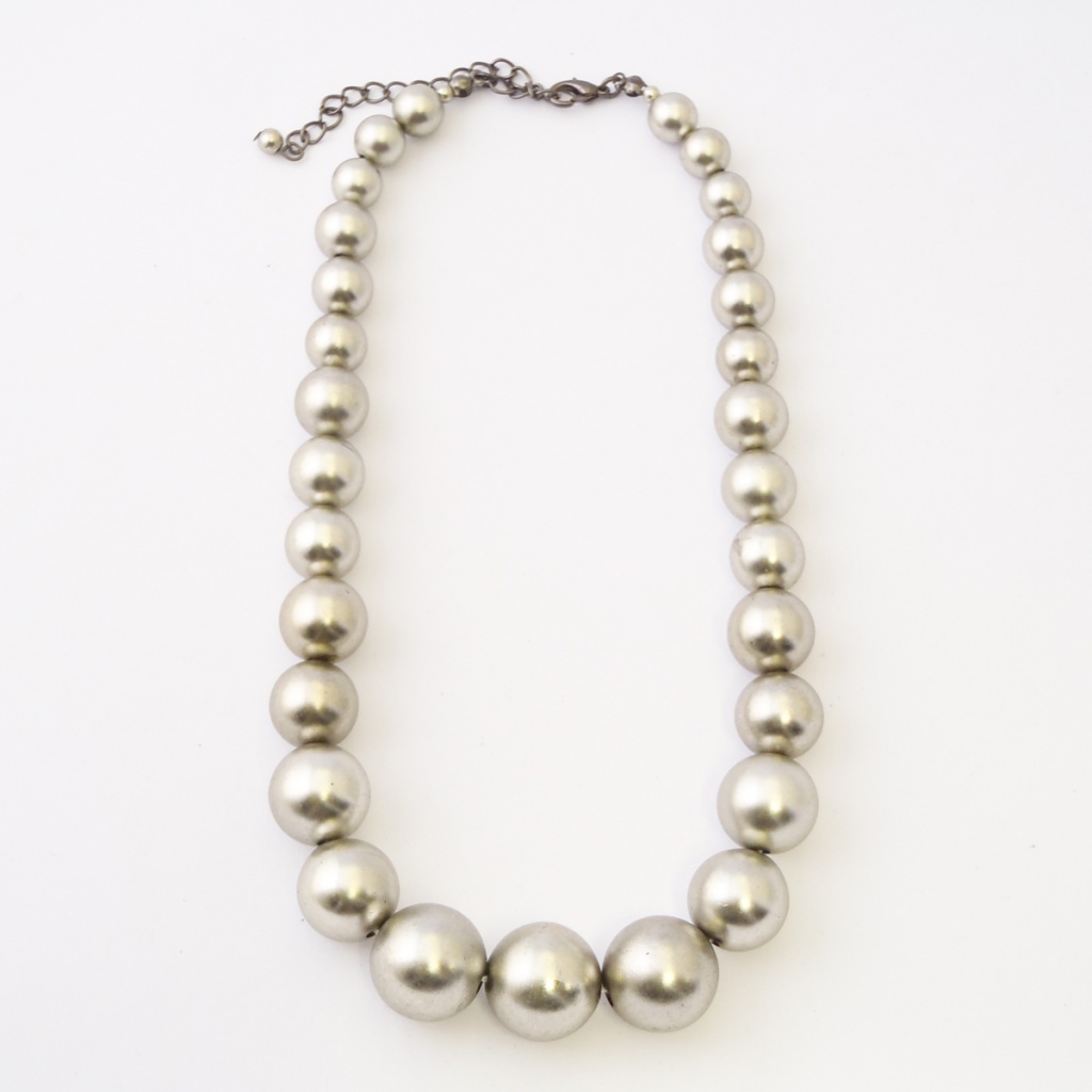 Náhrdelník z dřevěných korálků ve stříbrné barvě.