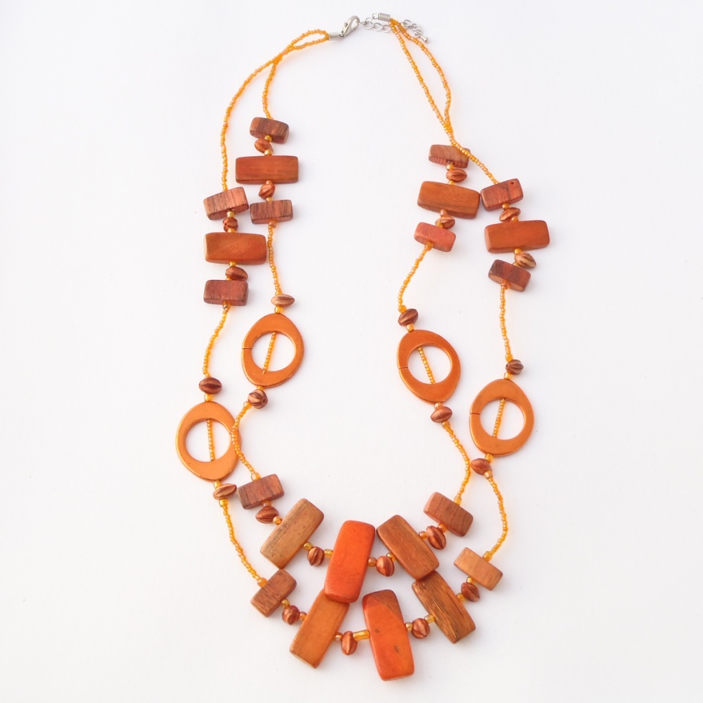 Náhrdelník z dřevěných komponentů.