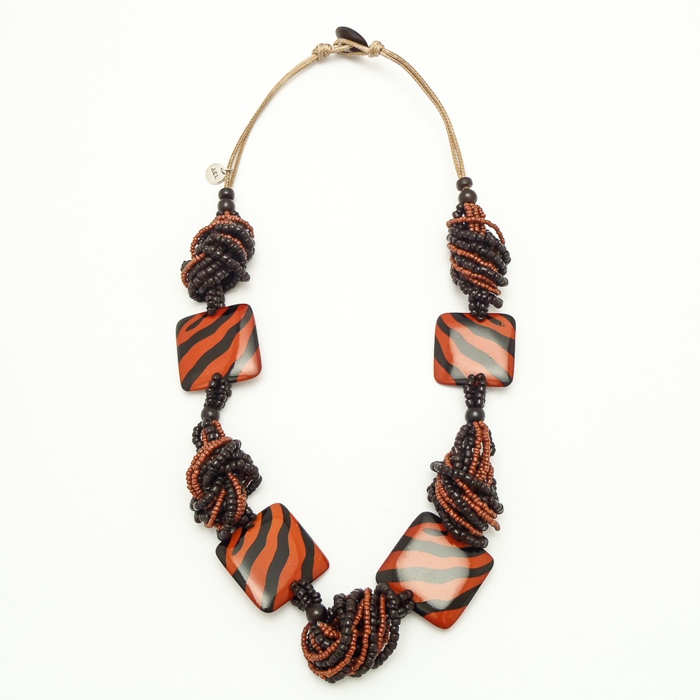 Náhrdelník z dřevěných korálků a dřevěných čtverečků s tiskem.