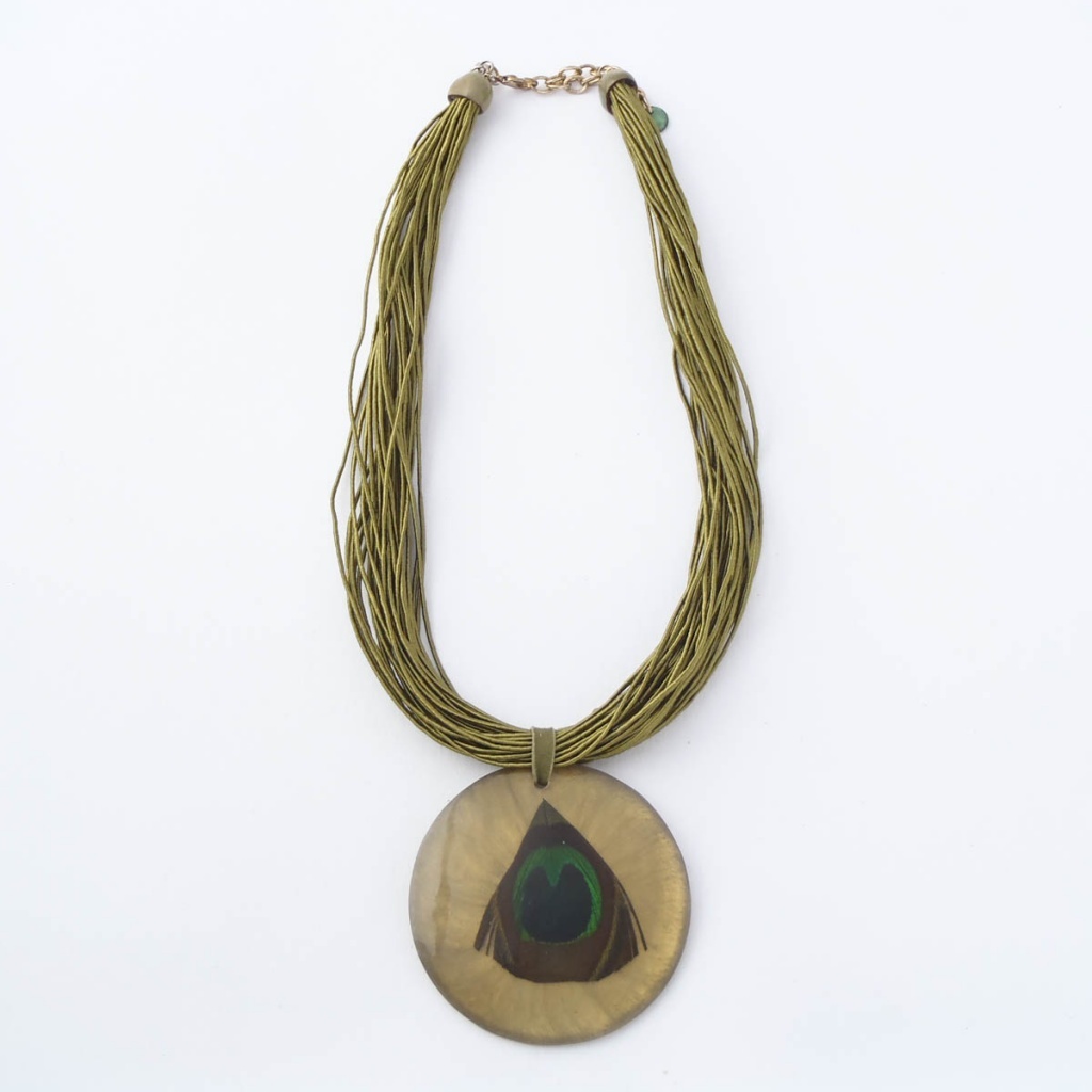 Přívěšek z pryskyřice se zalitým pavím peřím.