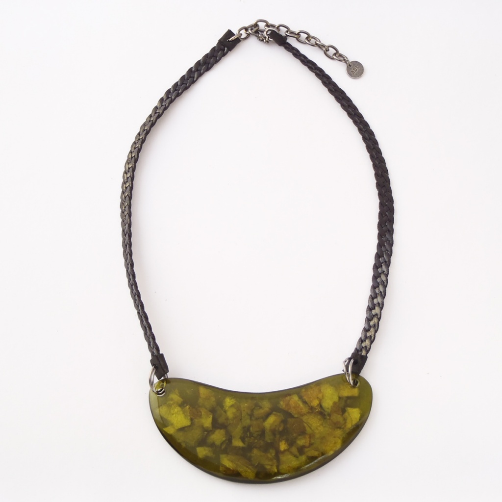 Náhrdelník s přívěškem z pryskyřice se zalitou perletí, zavěšené na textilní povoskované šňůrce.