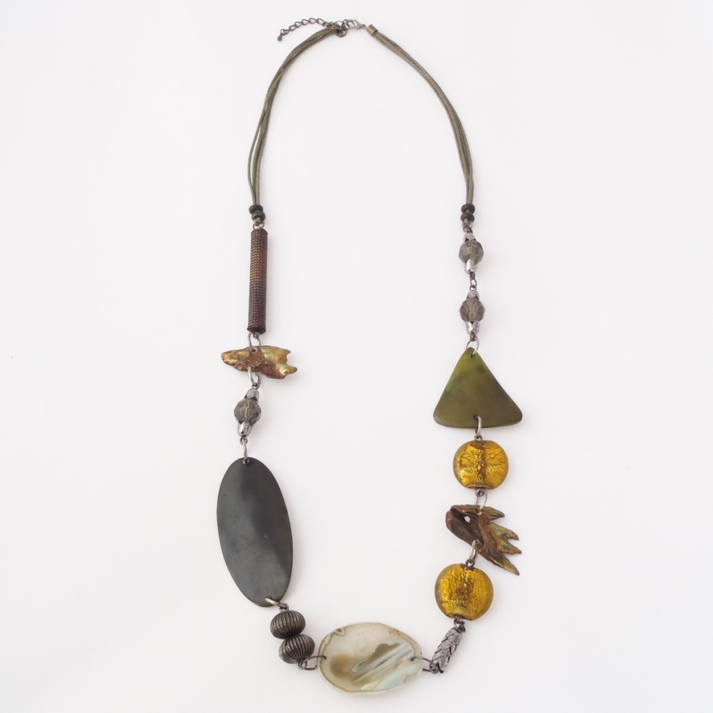 Náhrdelník z říčních perel, achátu, pryskyřice, rohoviny a bižuterního kovu.