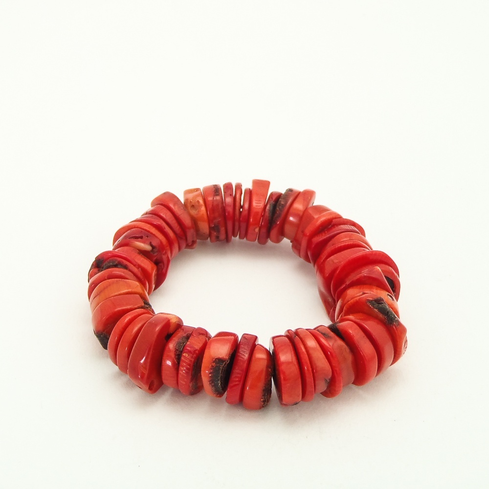 Náramek z korálu, který je navléknutý na pružném silonu.