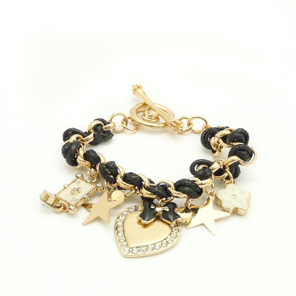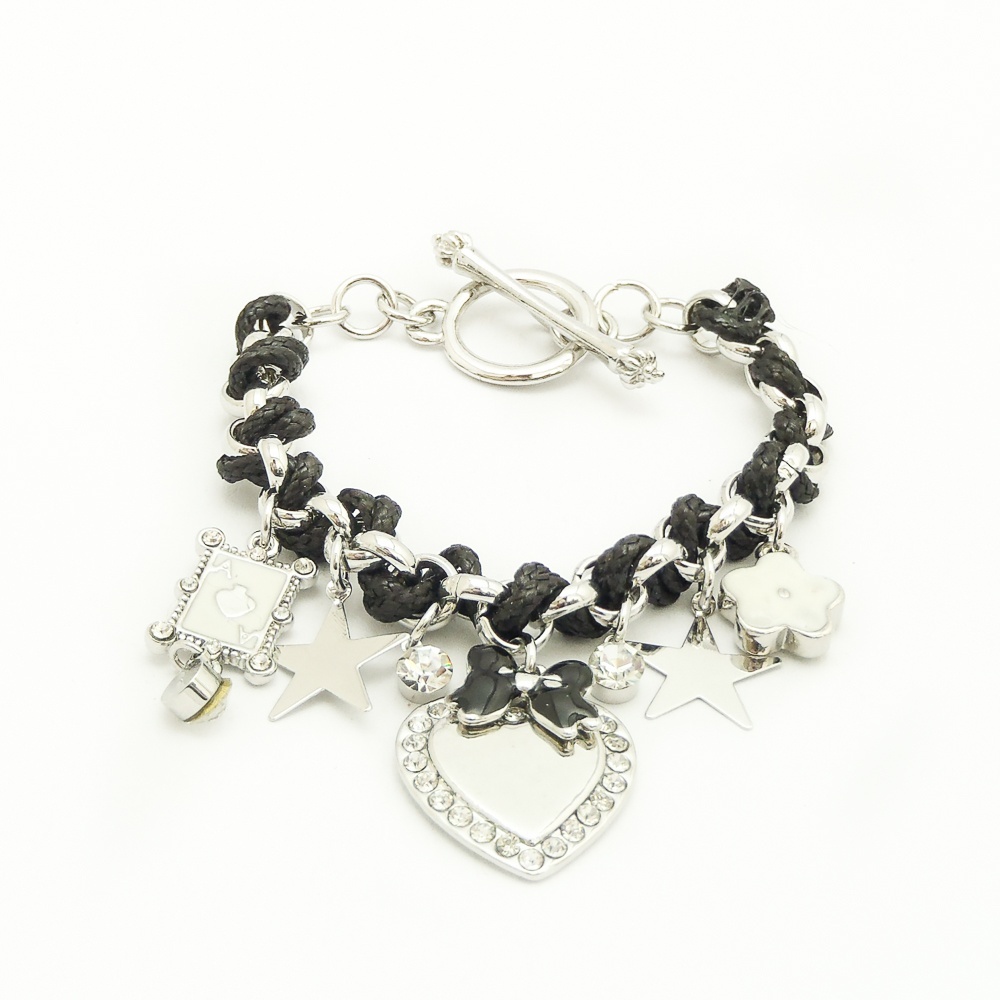 Náramek z řetízku, který je proplétaný povoskovanou textilní tkanicí.