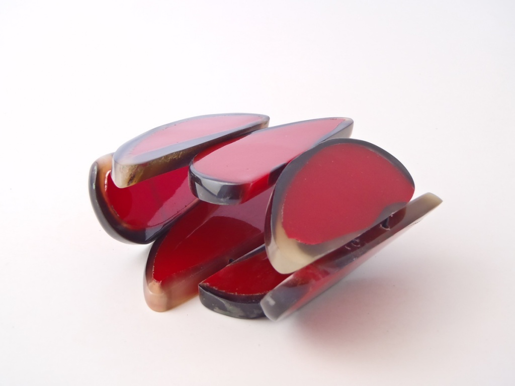 Náramek z rohoviny a pryskyřice. Náramek je navléknutý na gumičce.