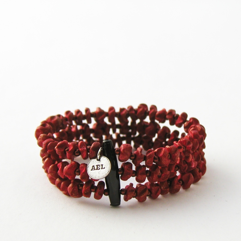 Náramek z kokosových komponentů navléknutých na gumičce. Výška náramku 3 cm.