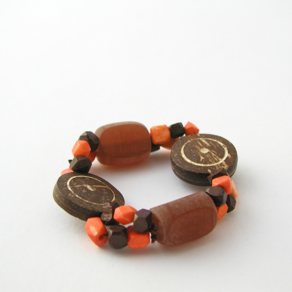 Náramek z kokosového ořechu a plastových komponentů. Náramek je navléknutý na gumičce.