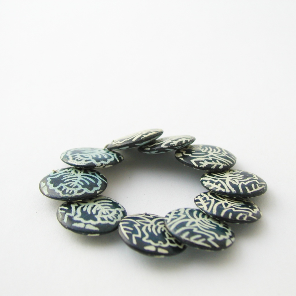 Dřevěný náramek s tiskem květin. Náramek je navléknutý na gumičce.