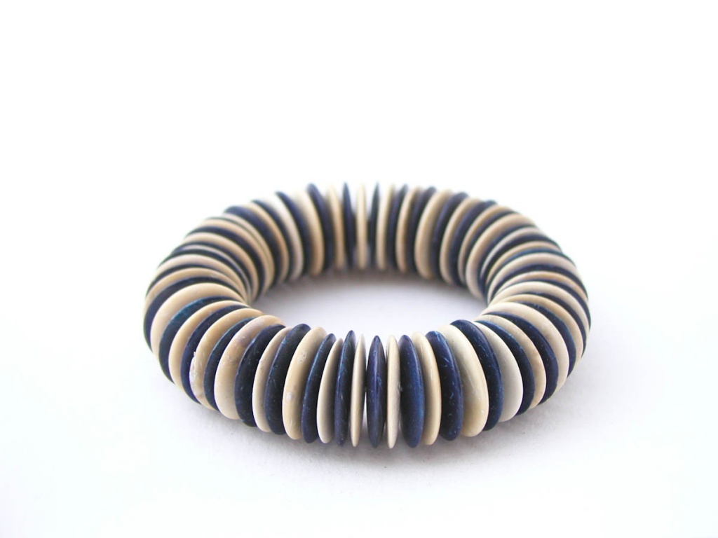 Náramek z kokosových slupek navléknuté na gumičce.
