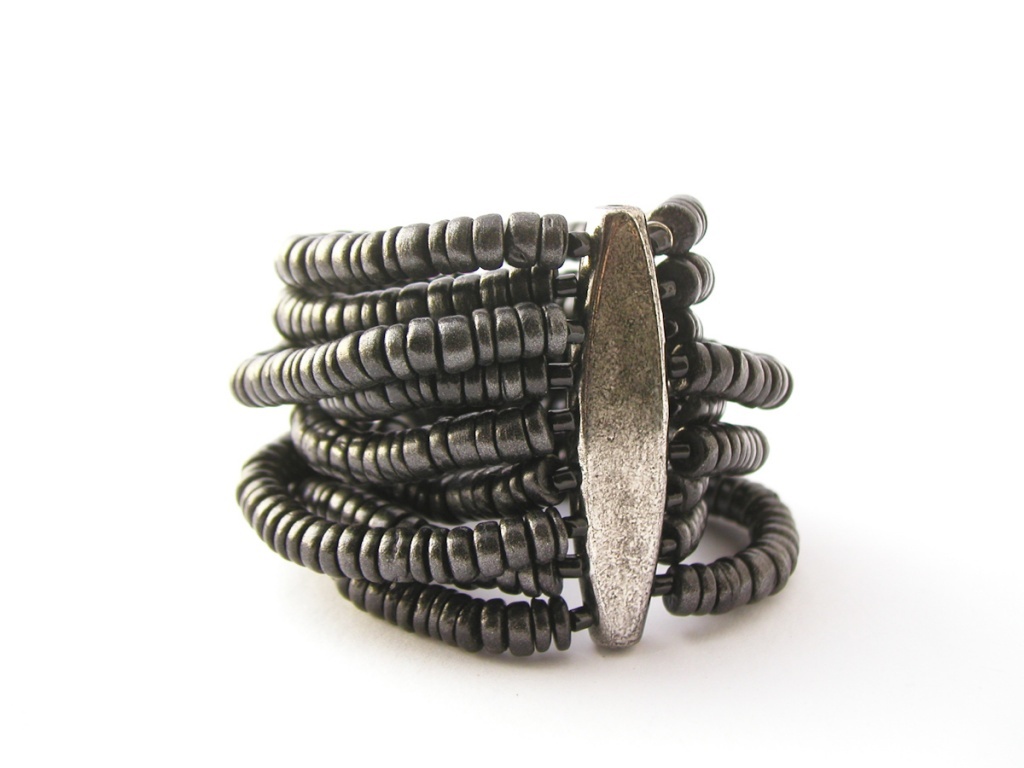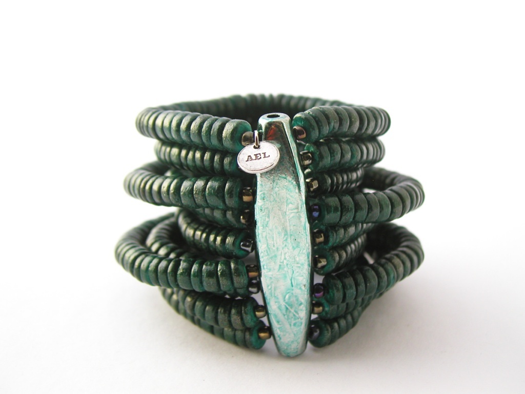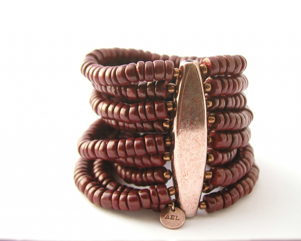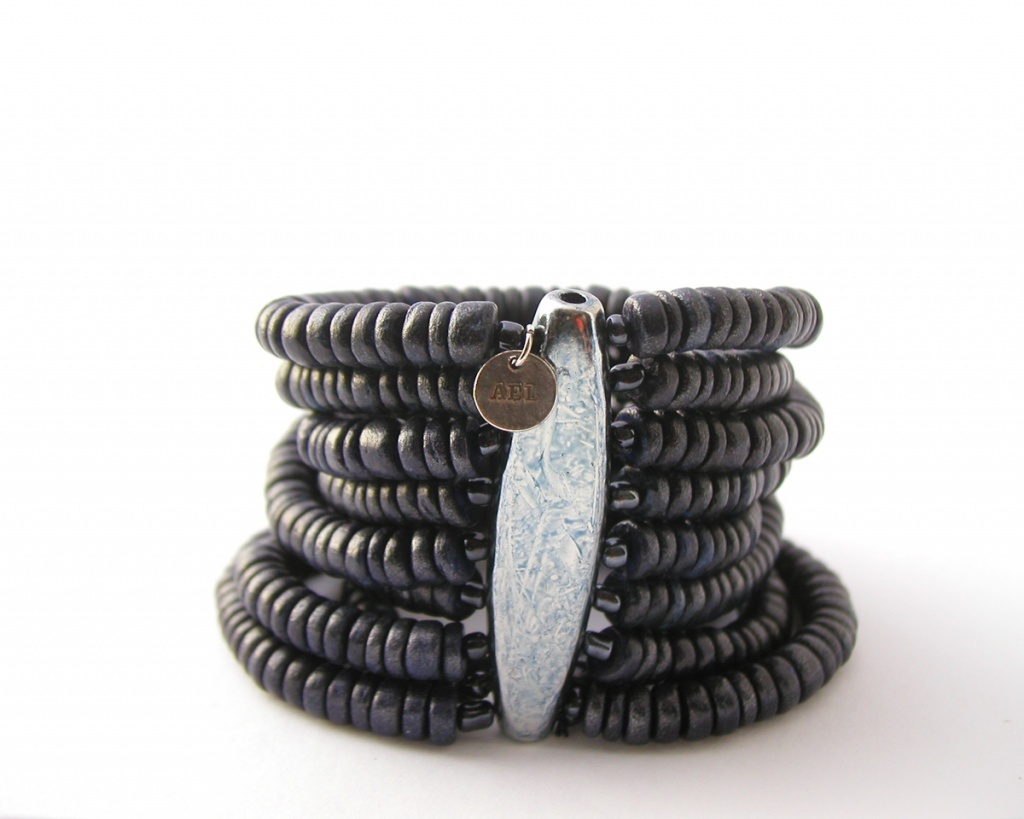 Náramek z kokosových korálků navléknutých na gumičce. Výška náramku je 6,5 cm.