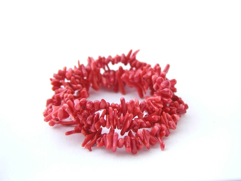 Náramek z korálu, který je navlečený na gumičce.