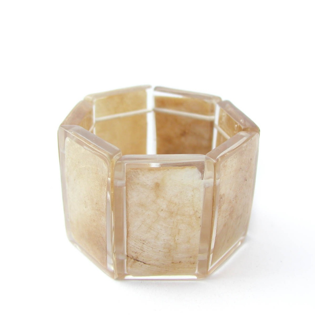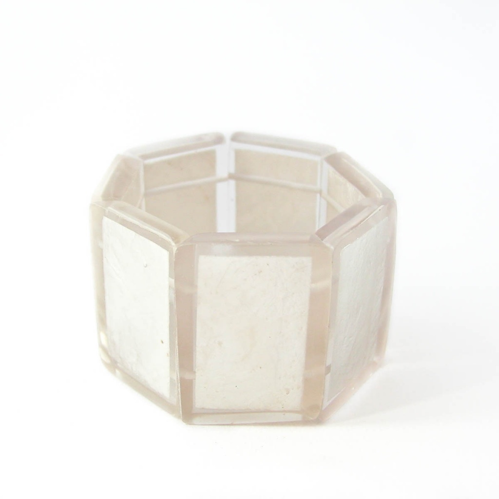 Náramek z pryskyřice se zalitou perletí. Náramek je na gumičce.