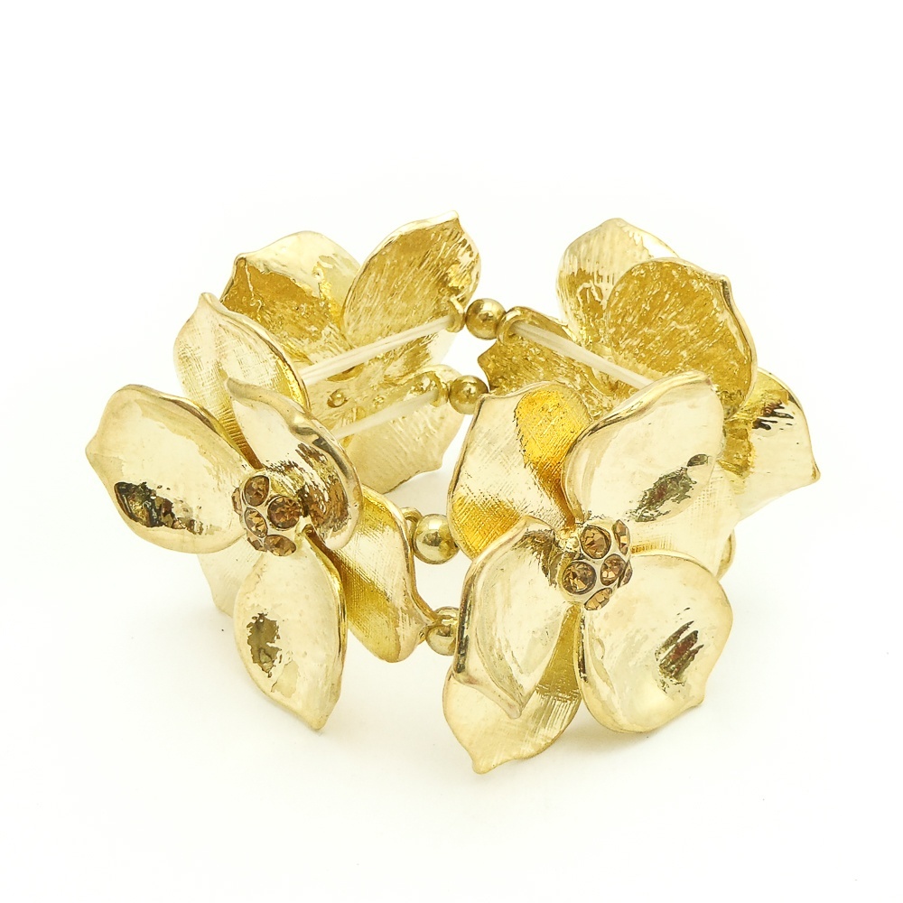 Náramek z květů z bižuterního kovu. Náramek je navléknutý na pružném silonu. Velikost jednu květu je 4,5x4,5cm.