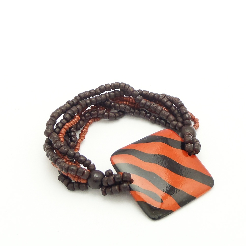 Náramek z dřevěných korálků a dřevěné placky opatřené tiskem. Náramek je navléknutý na pružném silonu.
