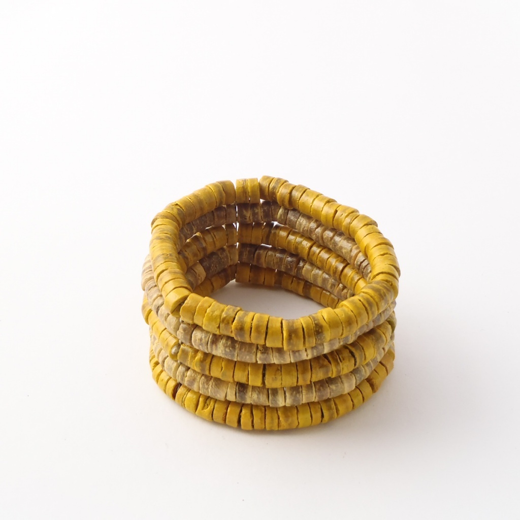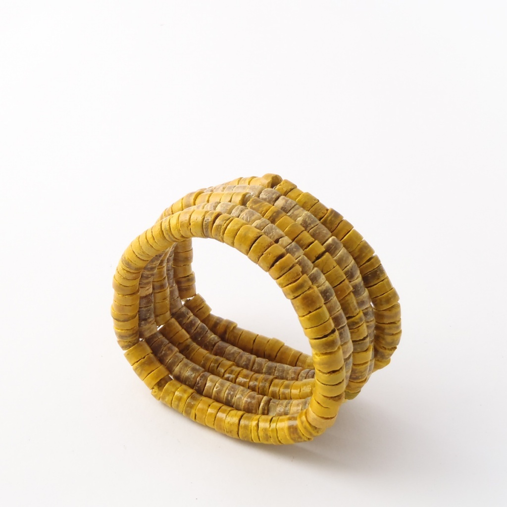 Náramek z dřevěných korálků navléknutých na gumičce.