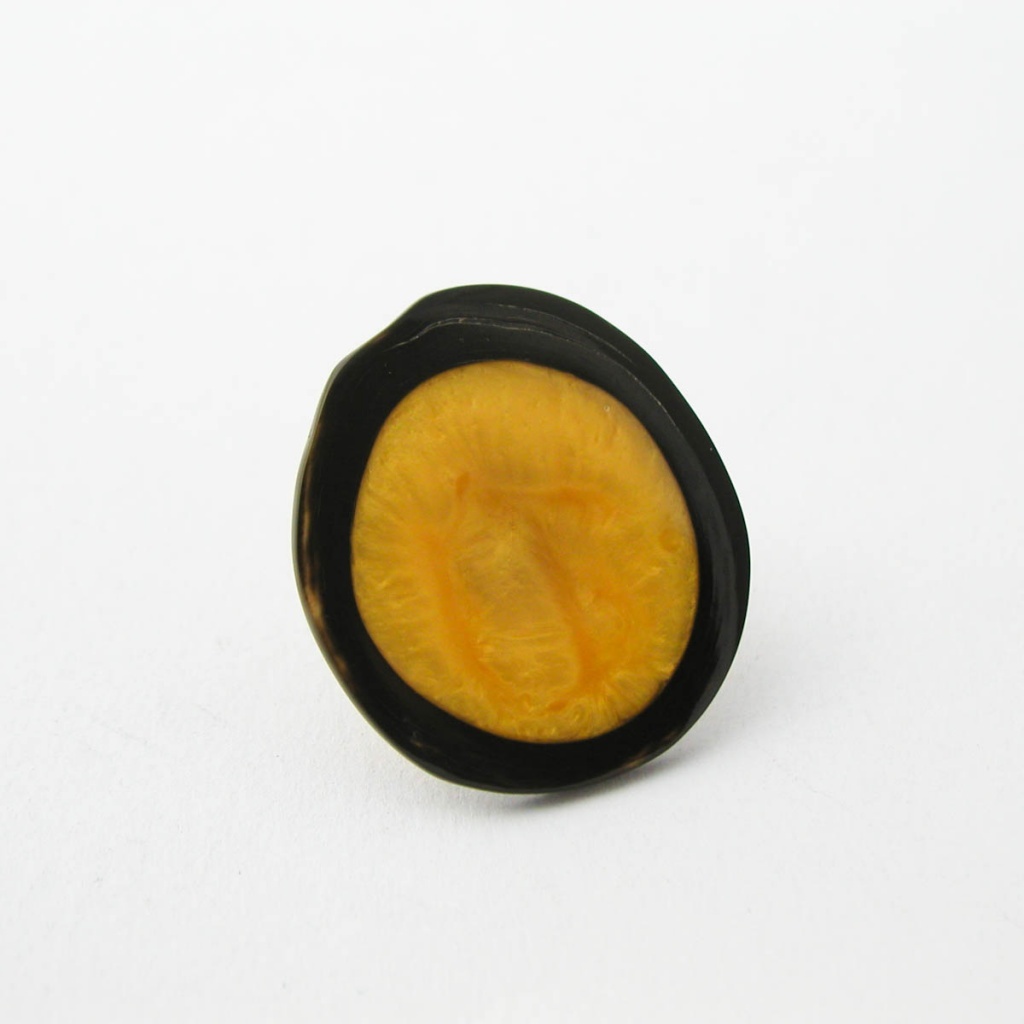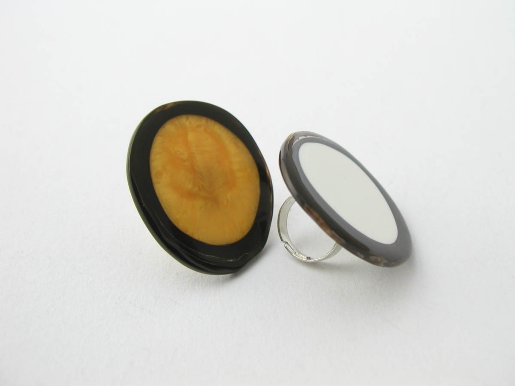 Prsten z pryskyřice se zalitou rohovinou. Prsteny mají nastavitelnou velikost.