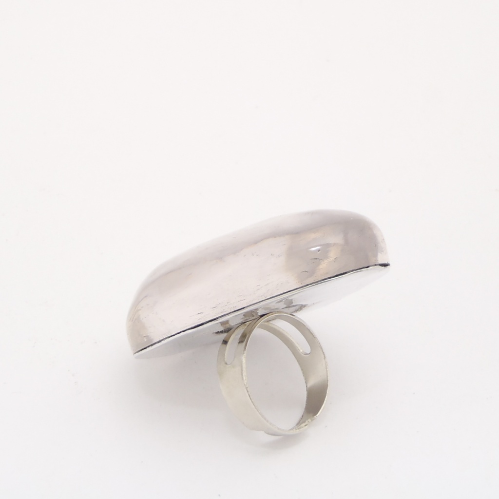 Prsten s nastavitelnou velikostí vyrobený z bižuterního kovu a pryskyřice.