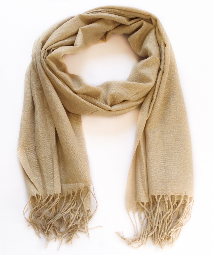 Pletený šál se zlatou nebo stříbrnou niťkou. Šál se hodí ke společenskému oblečení jako pléd. Velmi elegantní.