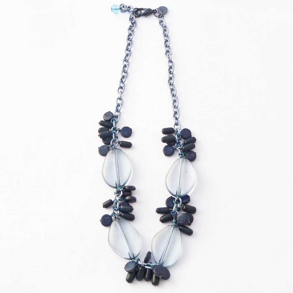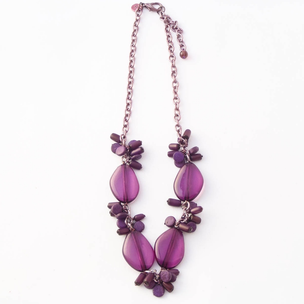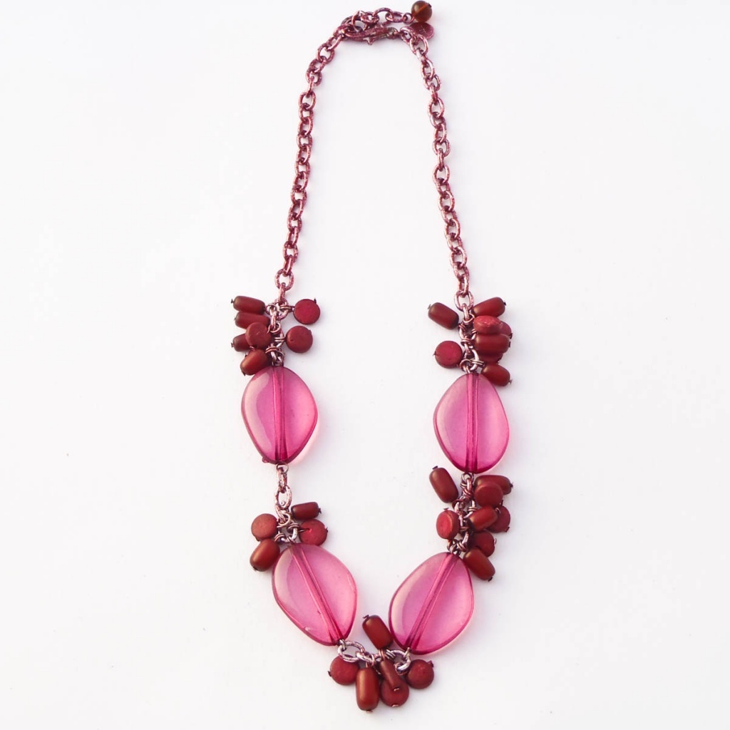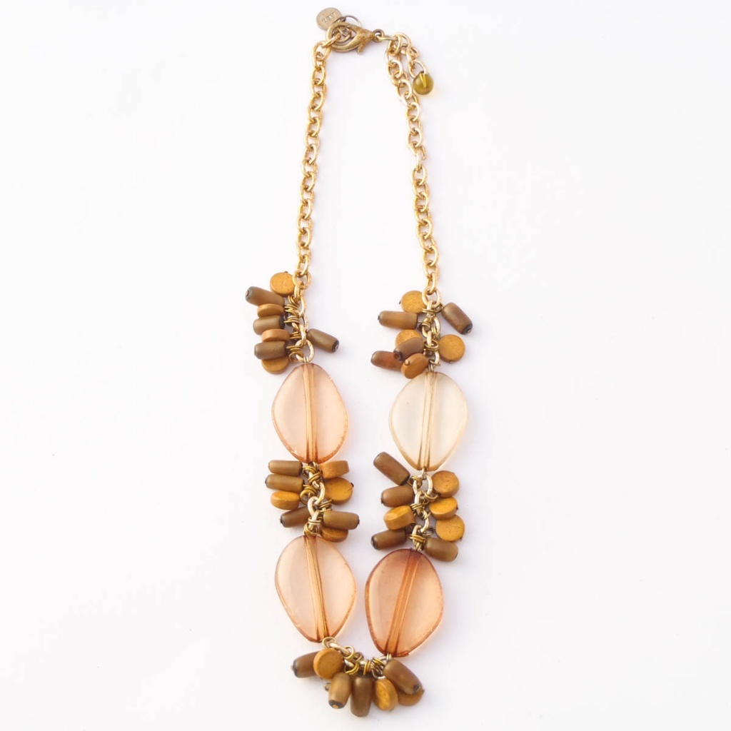 Náhrdelník z pryskyřice,dřevěných korálků a bižuterního kovu.