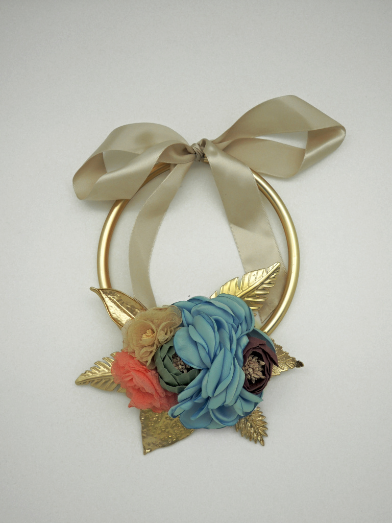 Zlatá kovová skruž s textilními doplňky v modré a růžové.