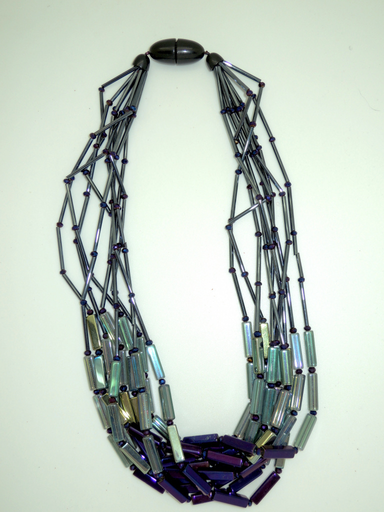 Náhrdelník ze skleněných korálků různých tvarů v modrofialové barvě